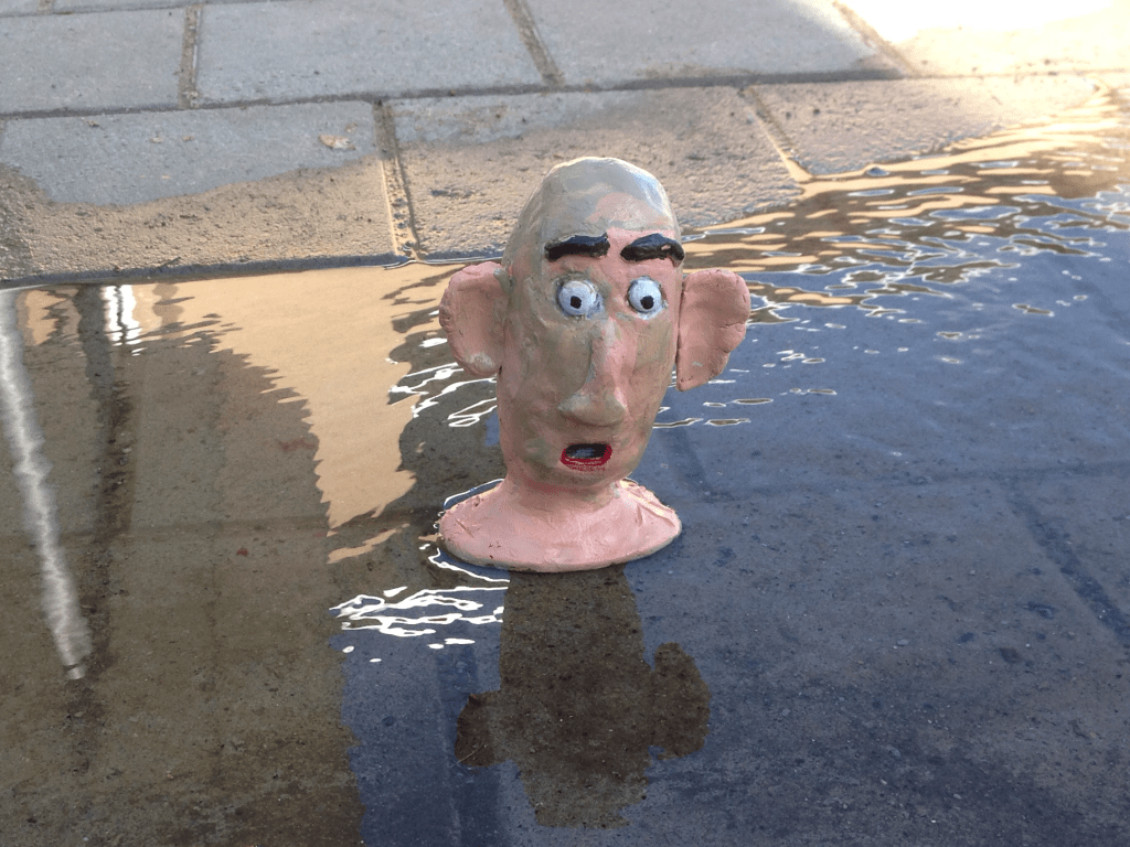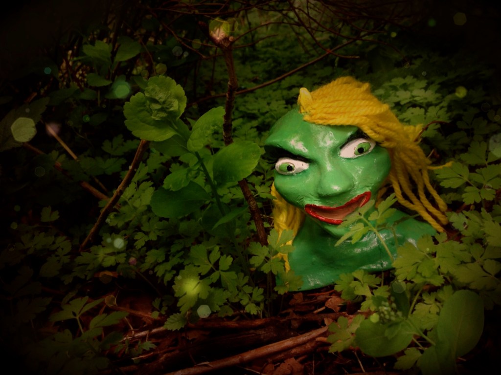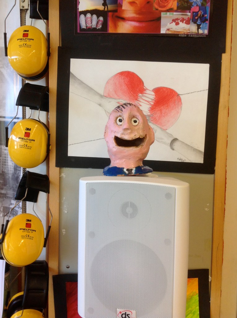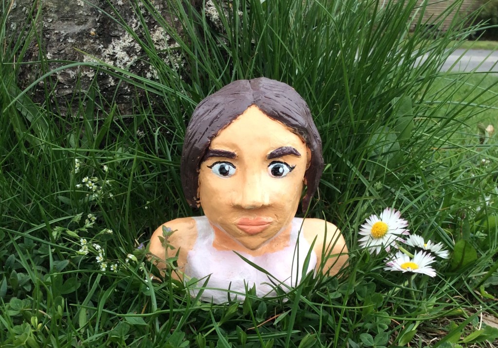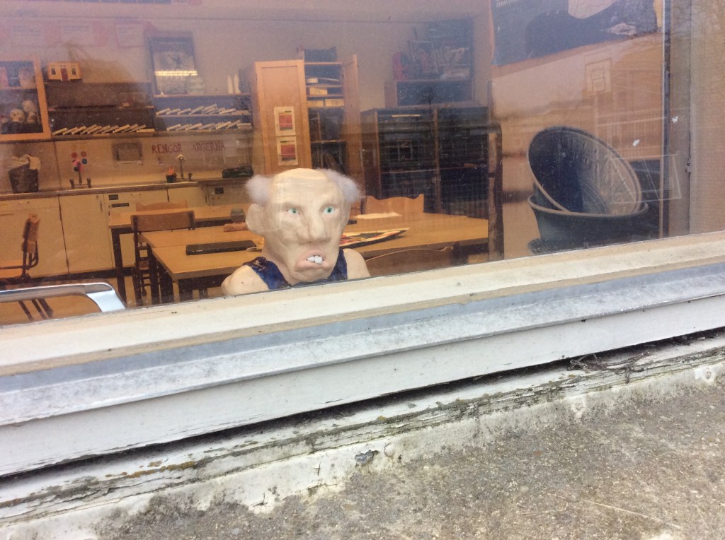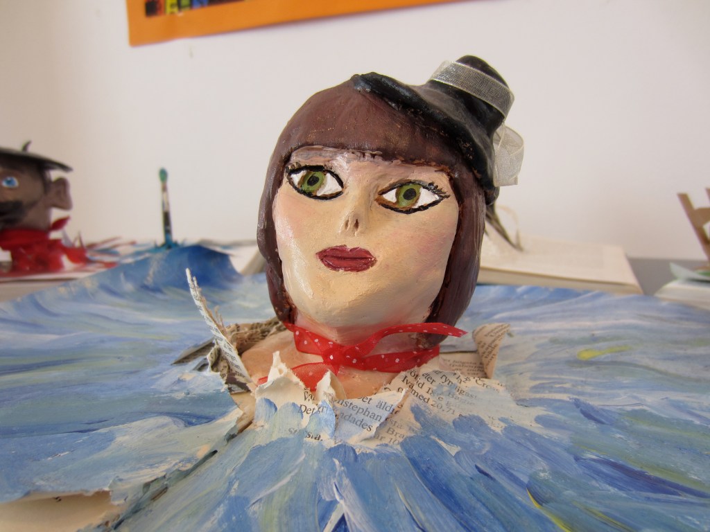 Elever i år 7 har fått i uppgift att skapa uttrycksfulla huvuden i lera, som de sedan målat och utsmyckat som de velat. Därefter har de placerats på passande ställen och fotograferats. Här ser du några exempel: