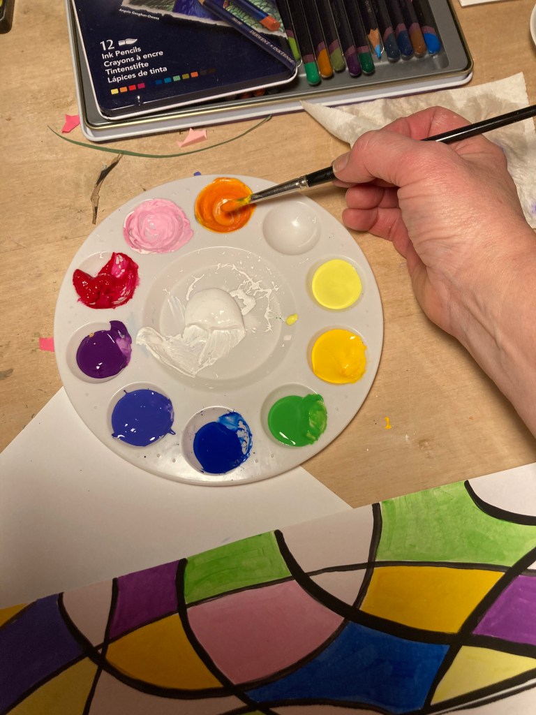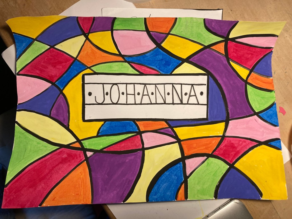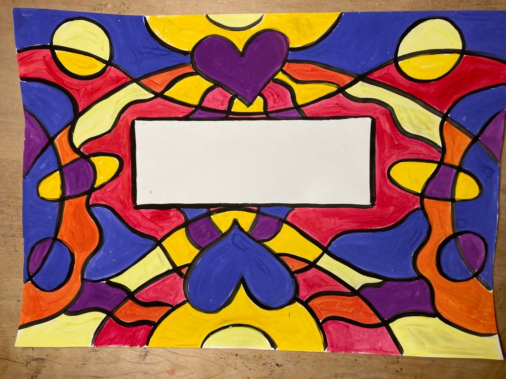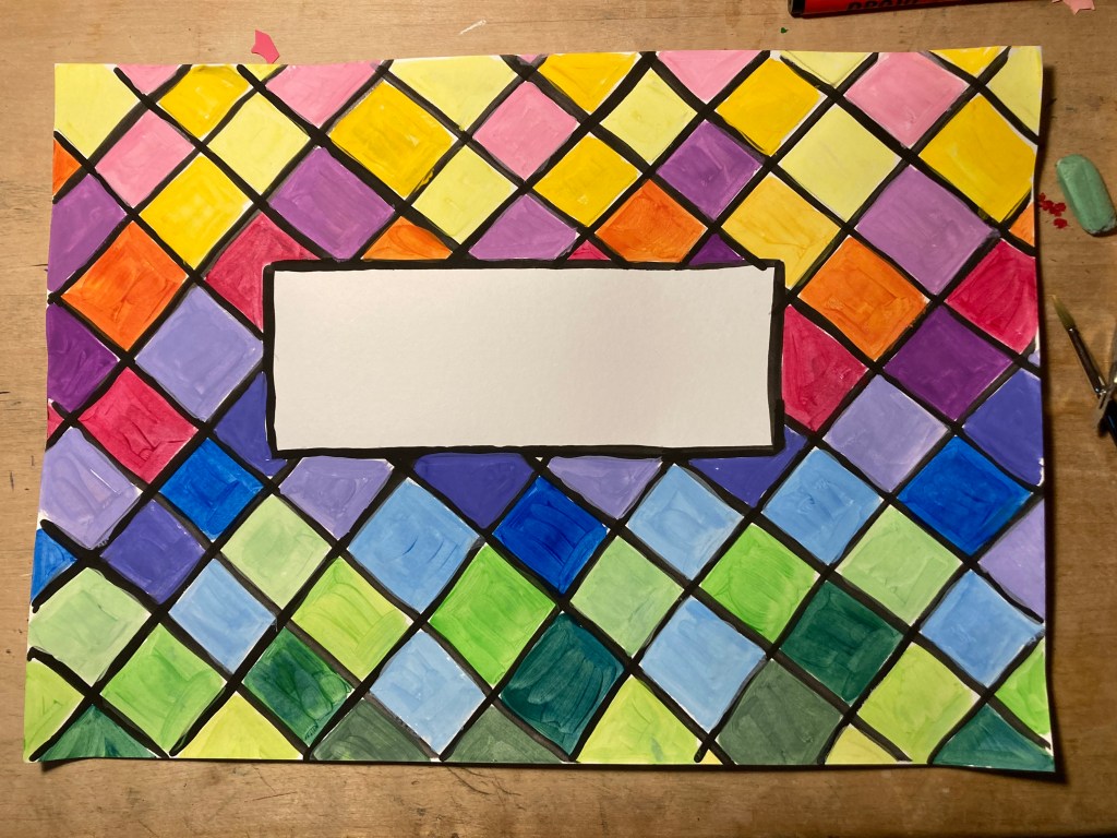 I denna övning skall vi skapa härliga mappar att förvara alla arbeten i. Vi kommer att arbeta med flytande temperafärg och pensel. Du övar på att skapa ett mönster och att använda olika färger och pensel. När man målar måste man fokusera på det man gör, samt vara noggrann. Detta är inget man kan från början, utan något man lär sig med tiden. Ge inte upp om det känns svårt – det är när det är svårt som hjärnan utvecklas.