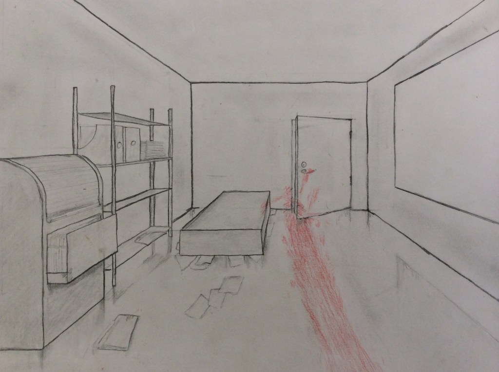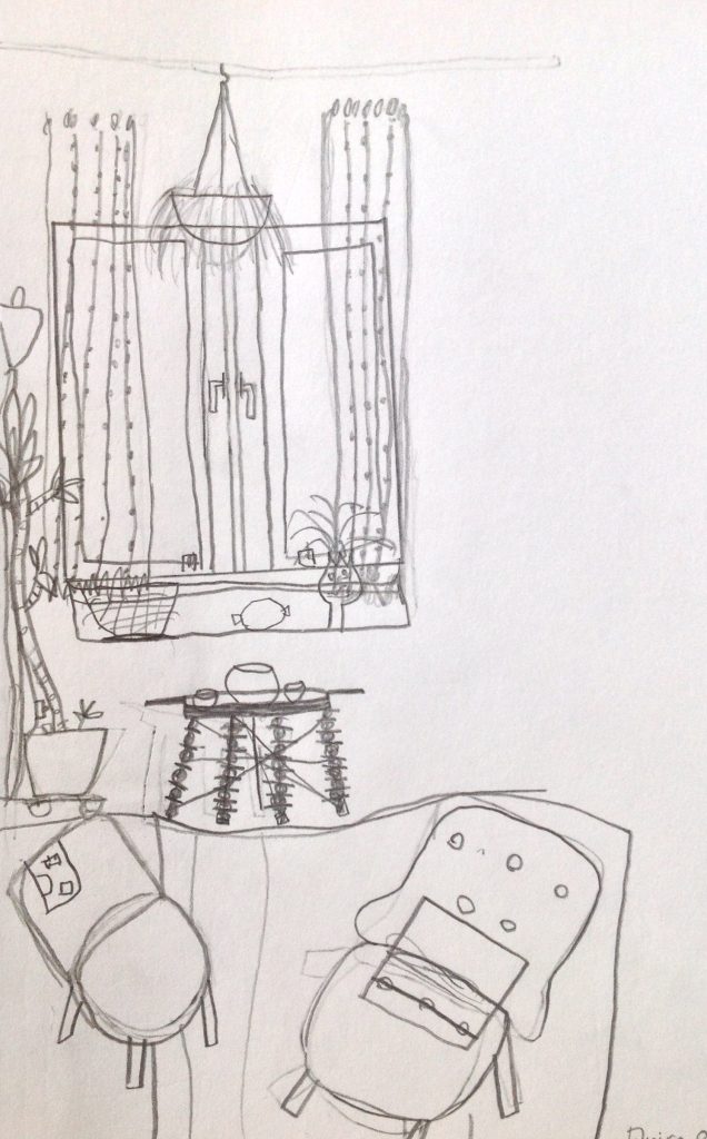 Rummet till vänster (barnteckningen) har inget perspektiv, medan de två rummen till höger har perspektiv. I denna övning skall du testa att rita ett eget rum med hjälp av tekniken.