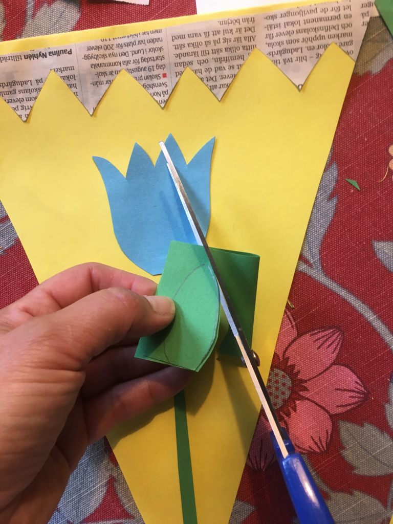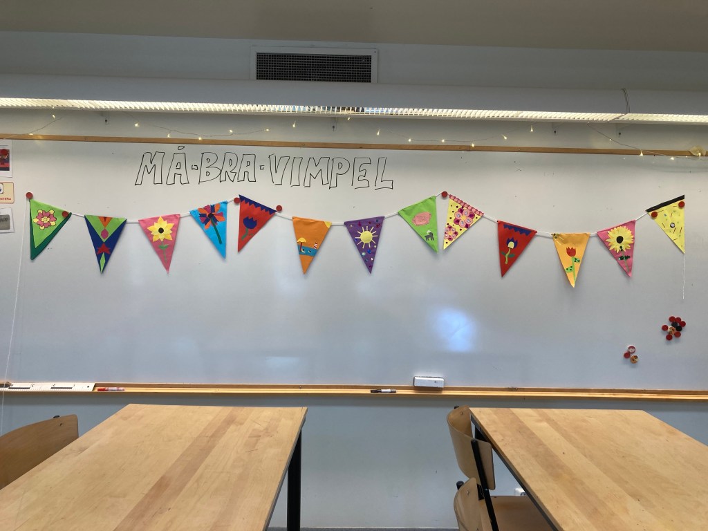 I denna övning skall vi skapa ett fint flaggspel till hemklassrummet. Alla bidrar med sin egen vimpel, gjord i klippteknik. Vi inspireras av blommornas magiska värld, men du kan också välja andra motiv, så länge det ser kul och fint ut. På baksidan skriver du tre saker som du mår bra av. Det är därför uppgiften heter ”Må-bra-vimpel”.